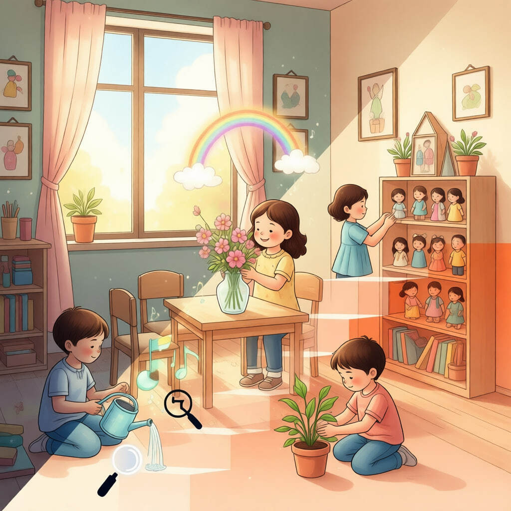 - Суть: Ребенок видит не задачу, а процесс создания красоты. Он не «дежурит», он — оформитель, дизайнер, создатель уюта.