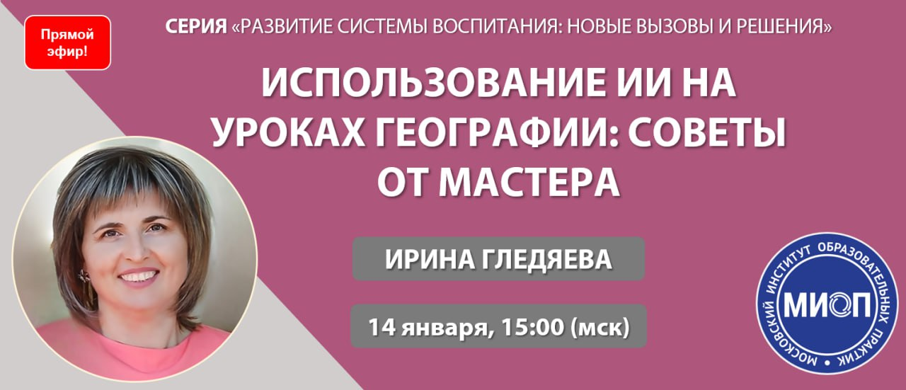 #ИИвОбразовании #География #ИскусственныйИнтеллект #УчительГеографии #ЦифроваяПедагогика #Промптинг #EdTech #НейросетиНаУроке #ИнтерактивныеКарты #ВПР #ОГЭ #ЕГЭ #Гледяева #МастерКласс #ПрямойЭфир #ВебинарДляУчителей #Методика #ПрофессиональноеРазвитие #Учителям #ОбразовательныеТехнологии #Школа